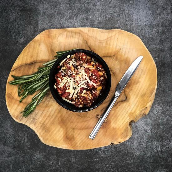 toast beleg gemaakt van fijn gemalen tartaar die op smaak gebracht is met o.a.